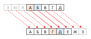 | Шифрований | Е | Є | Ж | З | И | І | І | Ї | Й | К | Л | М | Н | О | П | Р | С | Т | У | Ф | Х | Ц | Ч | Ш | Щ | Ь | Ю | Я | А | Б | В | Г | Д |