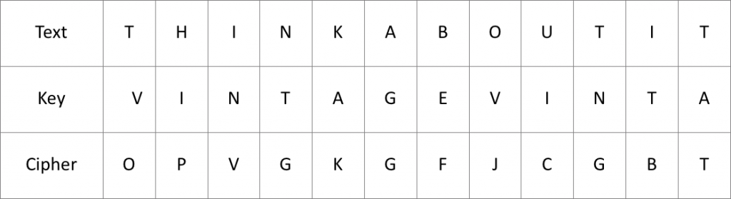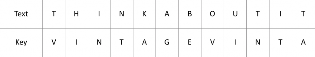 Завдання: Візьмемо VINTAG нашим ключовим словом. Щоб зашифрувати таку фразу, як THINK ABOUT, нам потрібно повторювати ключову фразу, поки вона не збігатиметься з довжиною відкритого тексту: