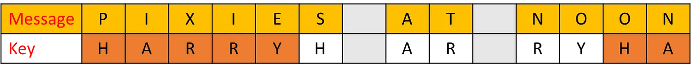 Напишіть своє повідомлення та повторюйте слово «Harry», поки не заміните всі літери в повідомленні. На малюнку 1 показано, як ви можете створити ключ, замінивши кожну літеру слова «Harry» на відповідну літеру в повідомленні.
