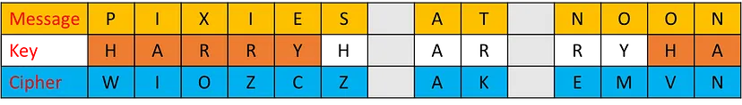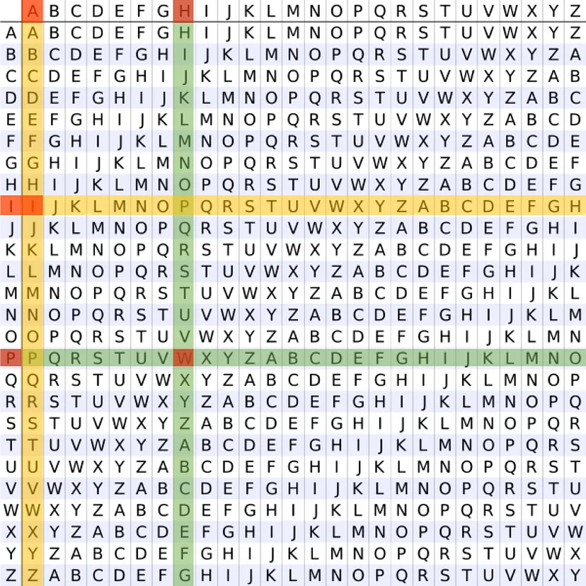 У крайньому лівому стовпчику знайдіть літеру «P» (перша літера повідомлення). Потім у самому верхньому рядку знайдіть букву «H» (перша літера ключа). Потім знайдіть літеру, яка знаходиться на перетині P-рядка та H-стовпця. Літера на перетині «W» є першою літерою зашифрованого повідомлення. Друга літера повідомлення в рядку I та друга літера ключа в стовпці A перетинаються біля літери «I». Подібним чином можна зашифрувати всі літери повідомлення. На малюнку 3 показано зашифрований текст після виконання процесу шифрування для всіх літер у повідомленні.